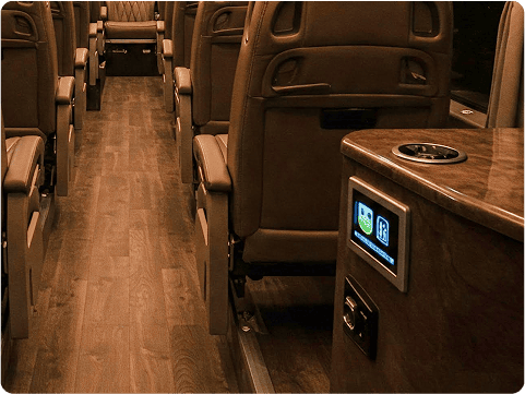 Luxuriate in our premium buses featuring rich leather seating and elegant wood flooring.